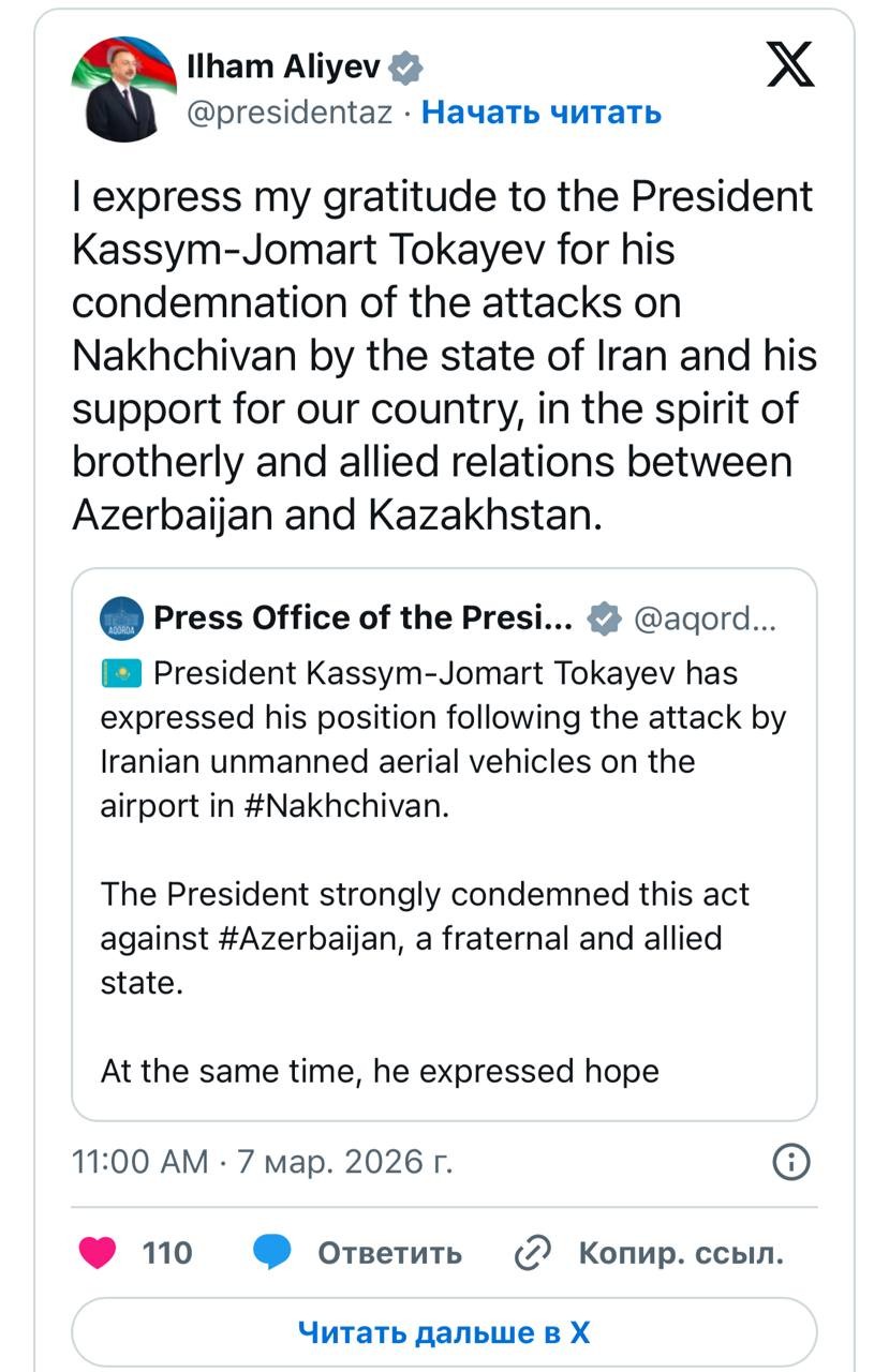 Об этом Ильхам Алиев написал на своей странице в соцсети X. Выражаю благодарность Президенту Касым-Жомарту Токаеву за осуждение нападений на Нахичевань со стороны иранского государства и за поддержку нашей страны в духе братских и союзнических ...Конституциялық реформа: халық таңдауы — құқықтық тұрақтылық кепілі